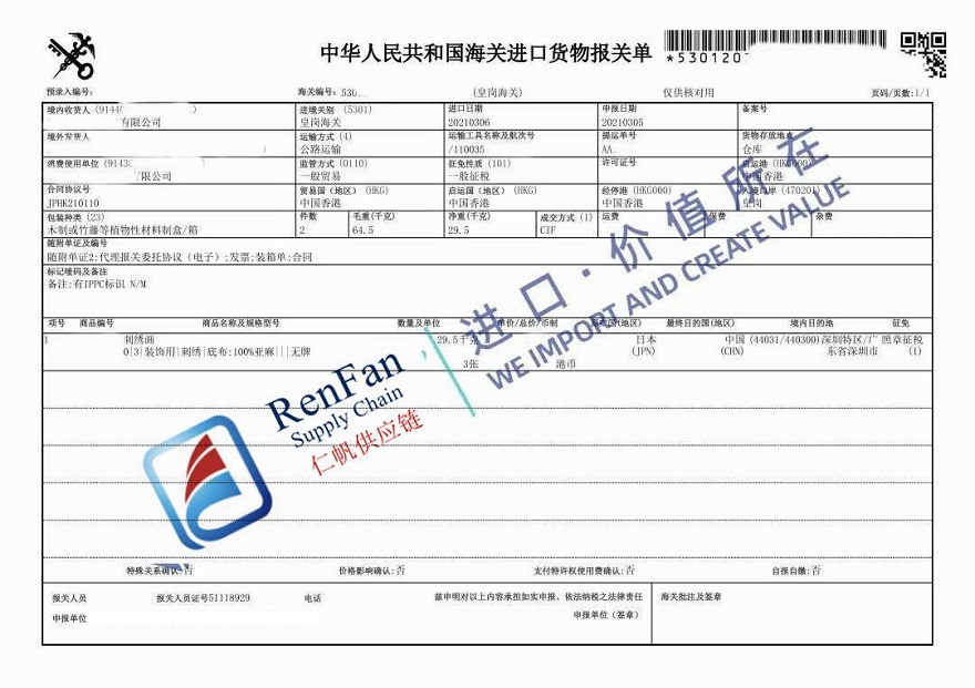 RenFan often gets involved in flow of artworks by providing logistics and China customs clearance services. As pictured, you can see two China customs declaration sheets for two artworks shipments that RenFan helped import to China. One shipment, contained with three pieces of embroidered paintings from Japan, was cleared by RenFan’s Shenzhen customs agent team at Shenzhen Huanggang. The other shipment was cleared by RenFan’s Guangzhou customs clearance services team at Guangzhou airport. It contained three pieces of oil paintings from USA.