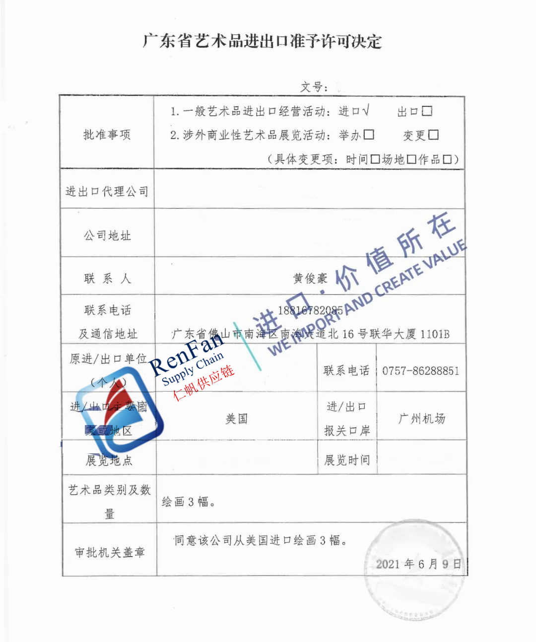 2.RenFan can help clients obtain import permit for artworks