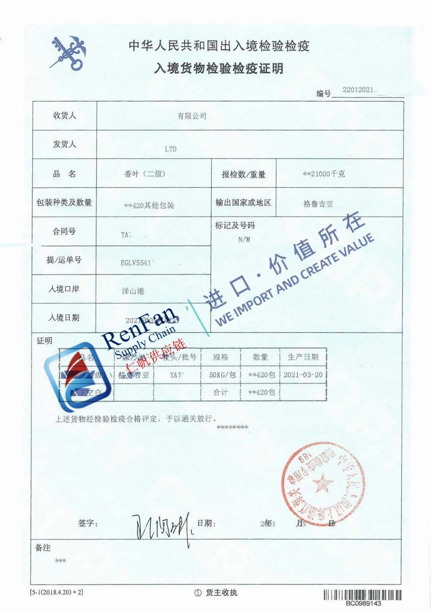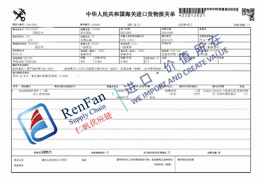 As pictured you can see a China customs declaration sheet which is for a shipment with Myrcia leaves originated in Georgia,RenFan's Shanghai customs agent helped import it. The Mycria leaves were imported as food flavour. The applied HS code was 09109900000, with 15% import duty and 13% VAT. Sales contract, invoice, certificate of origin, phytosanitary, ingredient list, China label and production date certificate were provided for Shanghai customs clearance handling. The operation flow was nothing special, just like other common food. Our Shanghai customs agent team completed all procedures in just 2 days. Everything went very smooth.