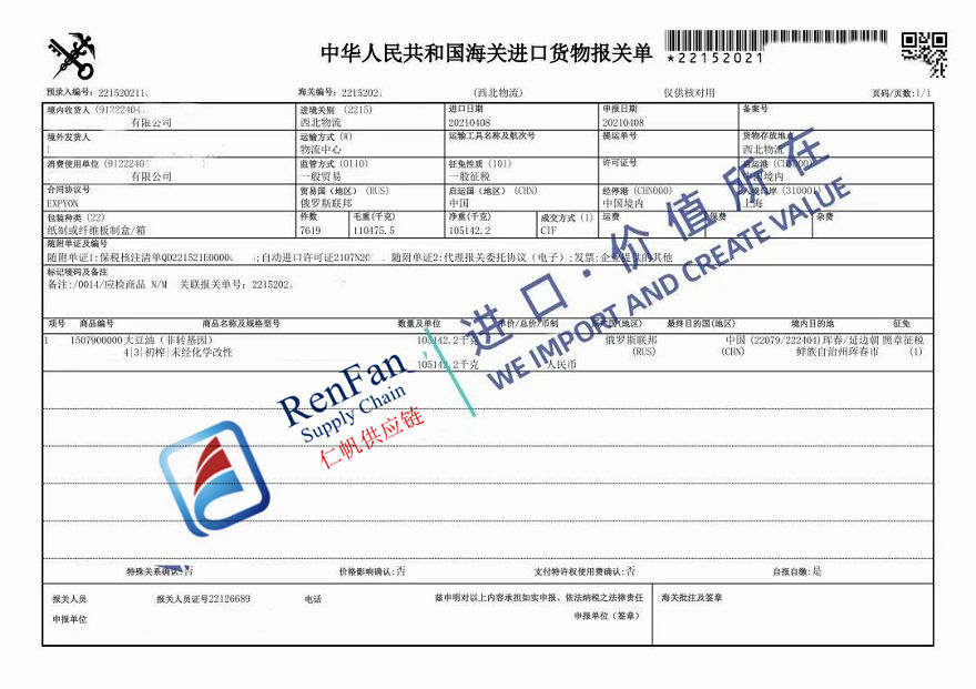 RenFan’s Shanghai customs agent team helped import a shipment with soybean oil at Shanghai port. The shipment contained 105142.2 kg souybean originated in Russia. As pictured, you can see the China Import Customs Declaration Sheet for this shipment. The appliable Chinese HS code for soybean oil is 1507900000, with 9% import duty and 9% value added tax.
