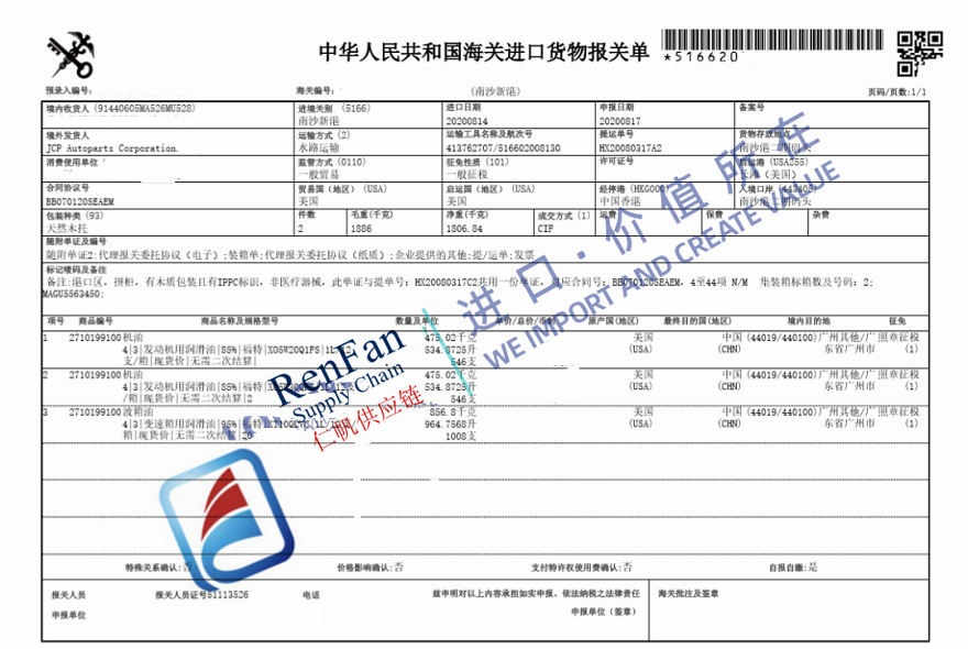 As below you can see a China Customs Declaration Sheet for a shipment with auto parts made in USA. RenFan’s Guangzhou customs agent helped clear the in Guangzhou Nansha port. The applied HS codes include 8708999990(with 6% import duty , 13% value added tax ), 8708801000(with 6% import duty , 13% value added tax), 8544302090(with 10% import duty , 13% value added tax, and 15% extra import duty for goods of USA origin ), and 8409919990(5% import duty , 13% value added tax) . Based on this case, RenFan would like to share more about getting auto parts imported into China as below.