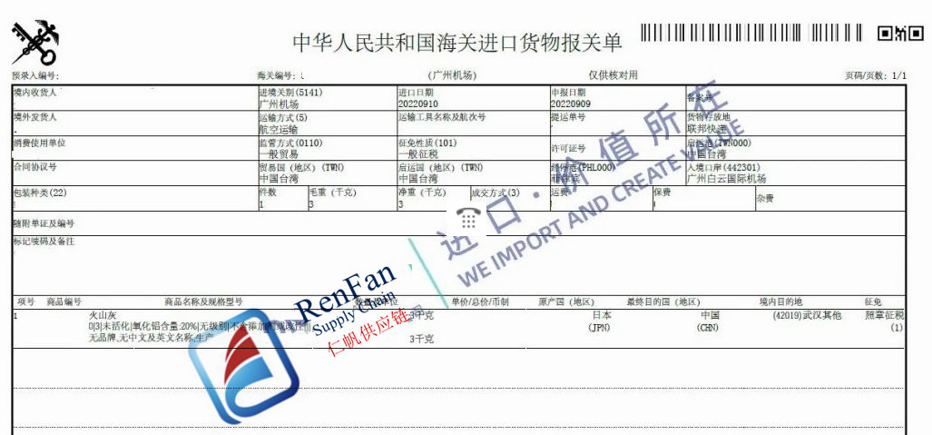 Volcanic ash refers to rubbles and mineral particles smaller than 2 mm in diameter from volcanic eruptions. In explosive volcanic activities, solid rocks and molten lava are broken down into fine particles and form volcanic ash. It has pozzolanic activity, that is, it can react with lime (CaO) at room temperature and in the presence of water to form hydrates with hydraulic gelling ability. Therefore, it can be used as a cement admixture and a concrete admixture after being ground. RenFan’s Guangzhou customs agent team recently helped import a shipment with volcanic ash from Japan. The HS code for volcanic ash is 2530909999, with 3% import duty (currently, there is a zero temporary rate) and 13% value added tax. The customs clearance was done at Guangzhou airport by RenFan Guangzhou team.