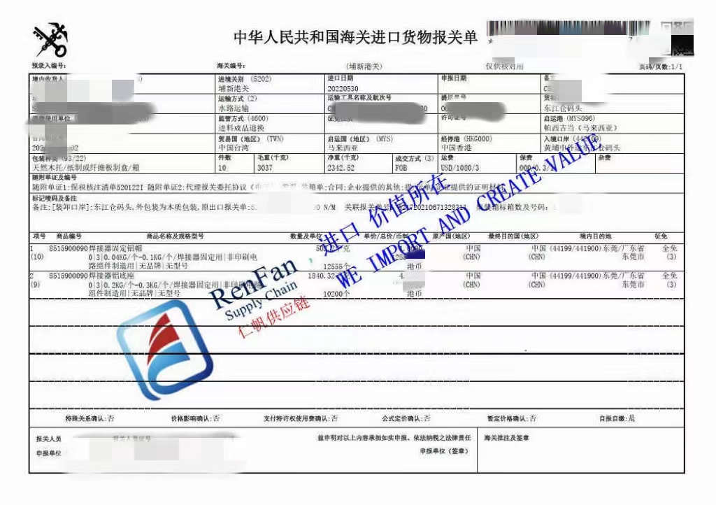 Guangzhou customs agent team of RenFan Supply Chain helped import a shipment with spare parts of welders under the supervision mode 4600 this year. As pictured, we share the the China customs declaration sheet for the shipment and also the relevant product info.