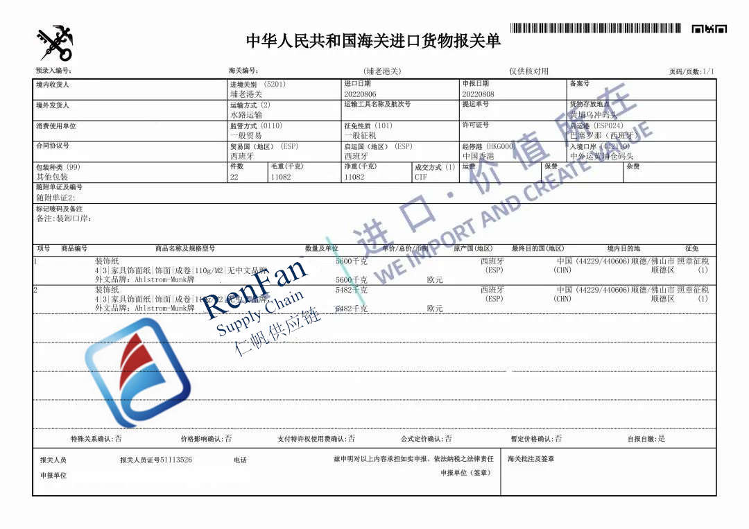 Decorative paper is one of the important building materials. It is widely used on furniture, cabinet, fire-proof plate and floor with nice decorative function. RenFan’s Guangzhou Customs Declaration Agency team recently helped clear a shipment with decorative paper from Spain. Totally 11082 kg decorative paper was involved. The customs declaration was initiated two days after the shipment arrived at Guangzhou Huangpu port and was completed on the same day of the declaration. As pictured you can see the China customs declaration sheet.