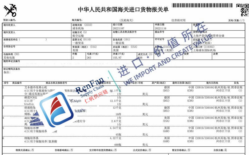 近年来,以基因工程、细胞工程、酶工程、发酵工程为代表的现代生物技术发展迅猛,并日益影响和改变着人们的生产和生活方式。这些技术相关的产品如培养基、专用的工具设备一部分是需要从国外进口。下面是我司的上海报关行近期在上海浦东机场代理进口了一批生物技术产品,包括冷冻离心机,梯度PCR仪, 凝胶电泳仪,细胞培养基,过滤柱,移液枪等,原产国涉及德国,英国和美国。附图可见相关进口报关单和部分产品的图片。这票货涉及的品名项数多,凭借经验,我们高效快速的完成了进口清关,客户相当满意。