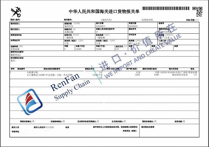 Renfan, the Guangzhou customs broker entrusted by the consignee of the Komastu bulldozer, attached great importance to the importation. To handle each step of the logistics properly and to maximize clearance efficiency, Renfan tried best to obtain support and guidance from Nansha customs. On the otherhand, Renfan communicated with the consignee actively and got paperwork ready in advance. After shipment arrival, Renfan seamlessly get D/O exchange, CIQ declaration, Customs Declaration, tax paymentand inspection done. Nansha customs conducted the inspection when the bulldozer was being unloaded from the vessel. The import customs clearance was done within one and half hour.