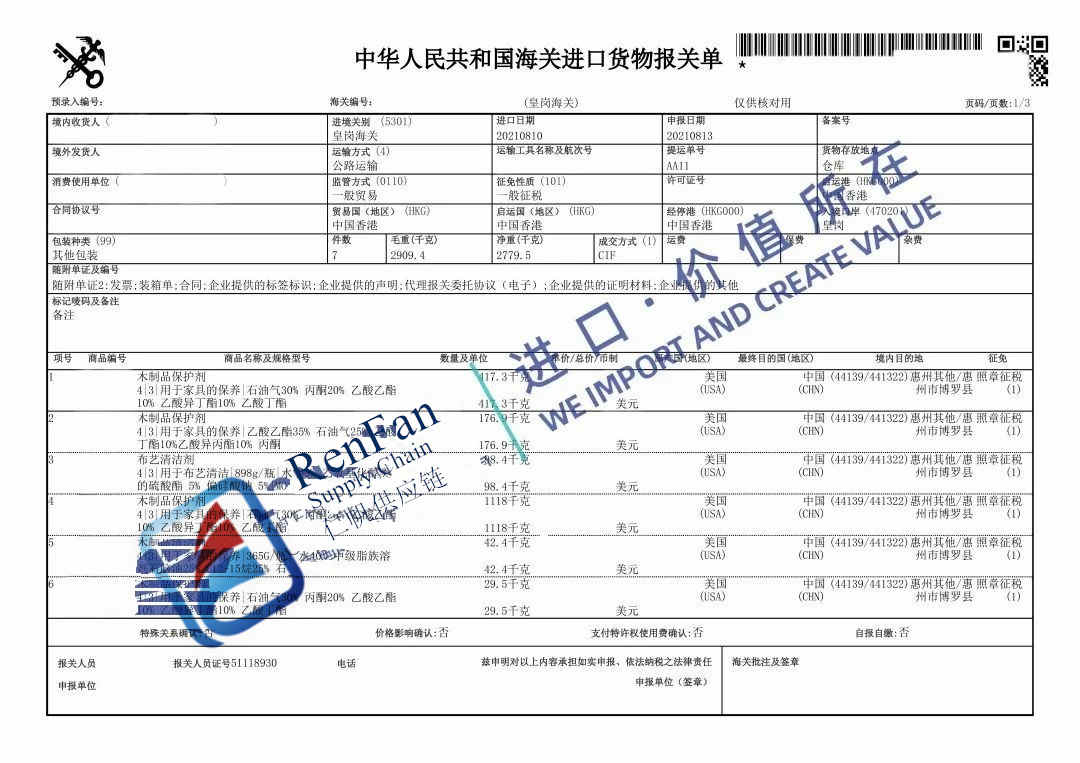 Class 2 hazardous goods mainly include compressed gas, non-flammable gas, and poisonous gas. The common class 2 hazardous goods include fire extinguisher, helium, spary paint, methane, dimethylmethane, liquid ammonia, carbon monoxide and air freshener. RenFan’s Shenzhen customs broker team recently handled the import customs clearance procedures for a shipment with class 2 hazardous goods, protective agent for woodwork and cleaning agent for home textile, from Hong Kong . As below is the customs declaration sheet.