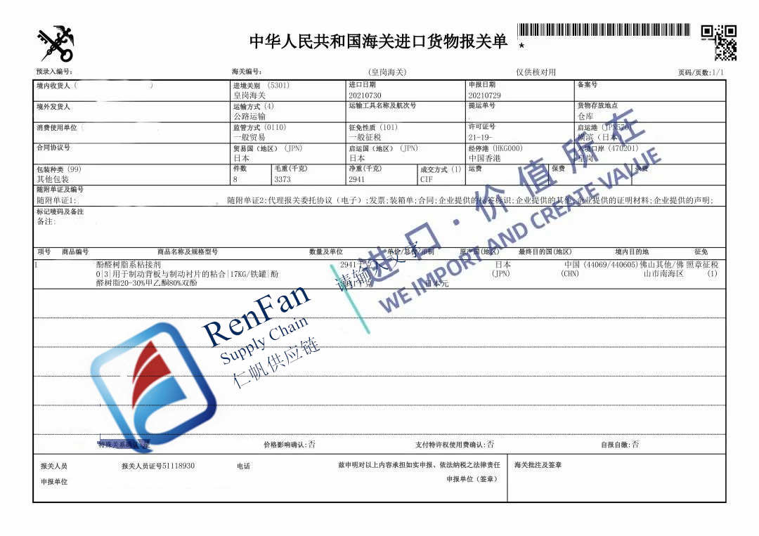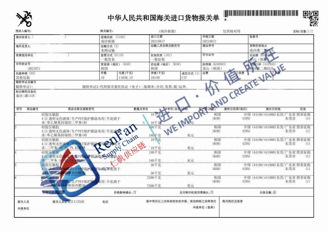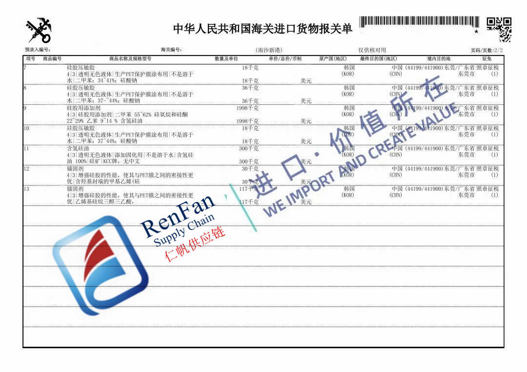 Class 3 hazardous goods is inflammable liquid, such as cementing compound, miscella, diluent and pressure sensitive adhesive. RenFan, as a well-known China customs clearance agent, often handles import customs clearance for hazardous goods. There are two sets of customs declaration sheets. One is for adhesive originated in Japan that RenFan’s Shenzhen customs clearing team helped import via Shenzhen Huanggang port, the other is for silicone pressure sensitive adhesive that RenFan’s Guangzhou customs clearance agent team cleared at Guangzhou Nansha Port.