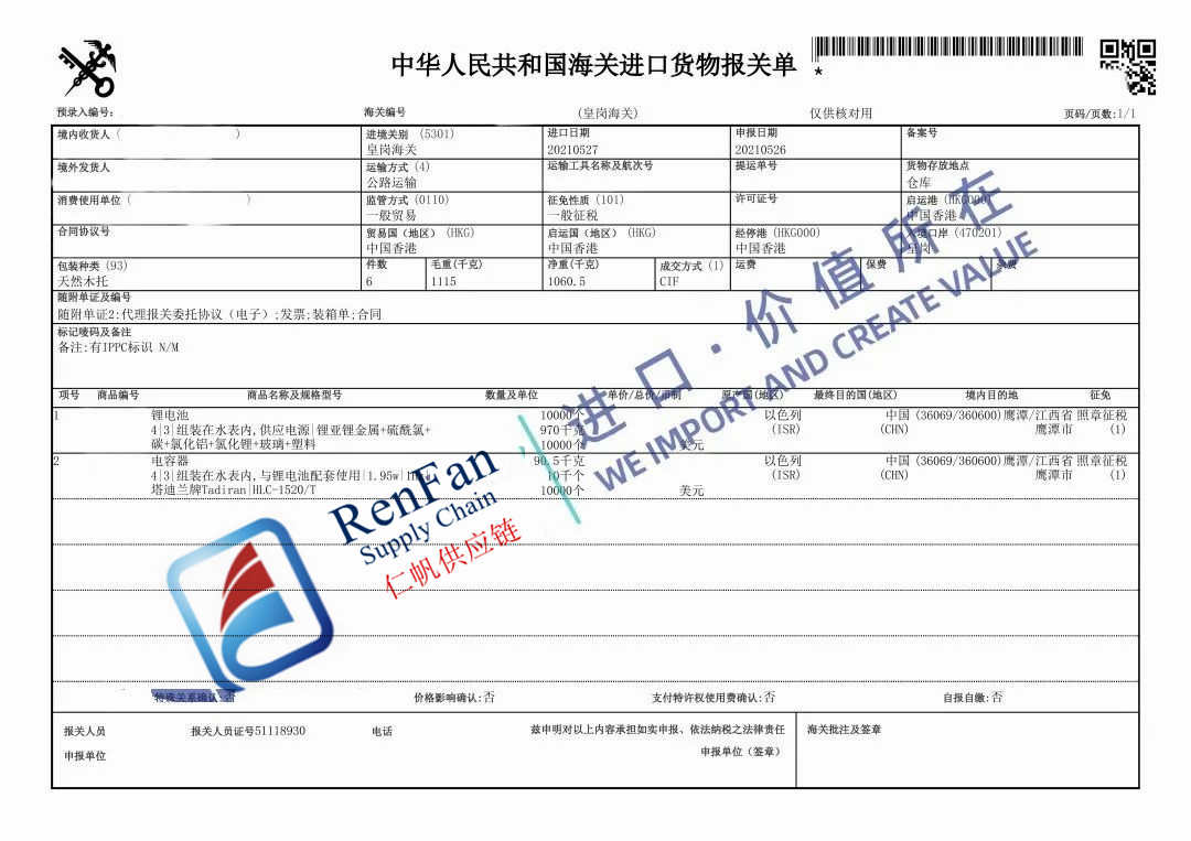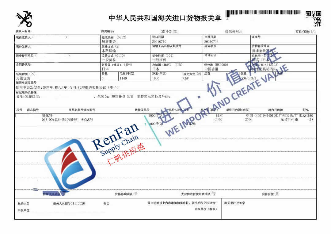 Class 9 Hazardous goods miscellaneous dangerous goods, for example lithium batteries and zinc oxide. As below you can see two customs declaration sheets. One is for a shipment with lithium batteries and capacitors that RenFan’s Shenzhen customs declaration agency team cleared at Shenzhen Huangpu team, the other is for zinc oxide that Renfan’s Guangzhou customs clearance agent team helped import via Guangzhou Huangpu port.