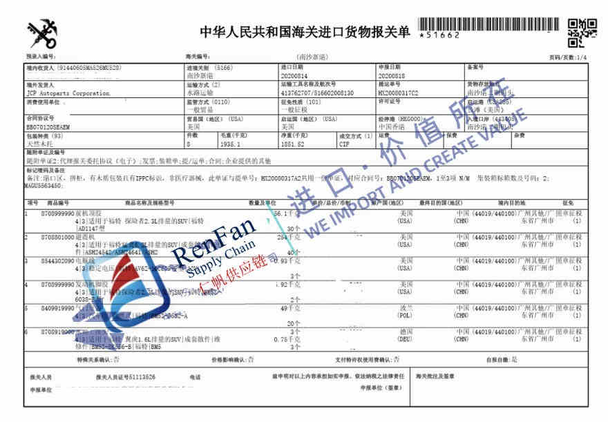 As below you can see a China Customs Declaration Sheet for a shipment with auto parts made in USA. RenFan’s Guangzhou customs agent helped clear the in Guangzhou Nansha port. The applied HS codes include 8708999990(with 6% import duty , 13% value added tax ), 8708801000(with 6% import duty , 13% value added tax), 8544302090(with 10% import duty , 13% value added tax, and 15% extra import duty for goods of USA origin ), and 8409919990(5% import duty , 13% value added tax) . Based on this case, RenFan would like to share more about getting auto parts imported into China as below.